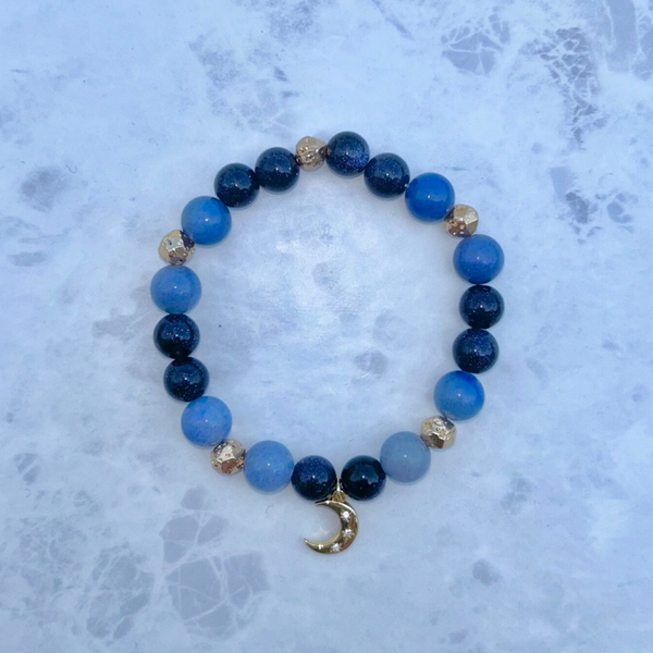 Introducing High Lady, a bracelet inspired by the fierce and resilient heroine of Sarah J. Maas' A Court of Thorns and Roses series. Adorned with blue sandstone and blue aventurine, this piece embodies Feyre's strength and wisdom. Blue sandstone enhances confidence and courage, while blue aventurine fosters inner peace and clarity. Wear High Lady to channel your own inner warrior and navigate your journey with grace and determination